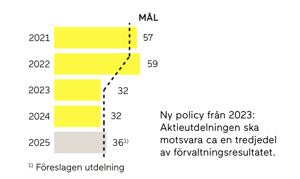 Ca en tredjedel av förvaltningsresultatet ska delas ut, såvida inte investeringar eller bolagets finansiella ställning i övrigt motiverar annat. Därutöver kan styrelsen föreslå att vinster av engångskaraktär kan föras över till ägarna.